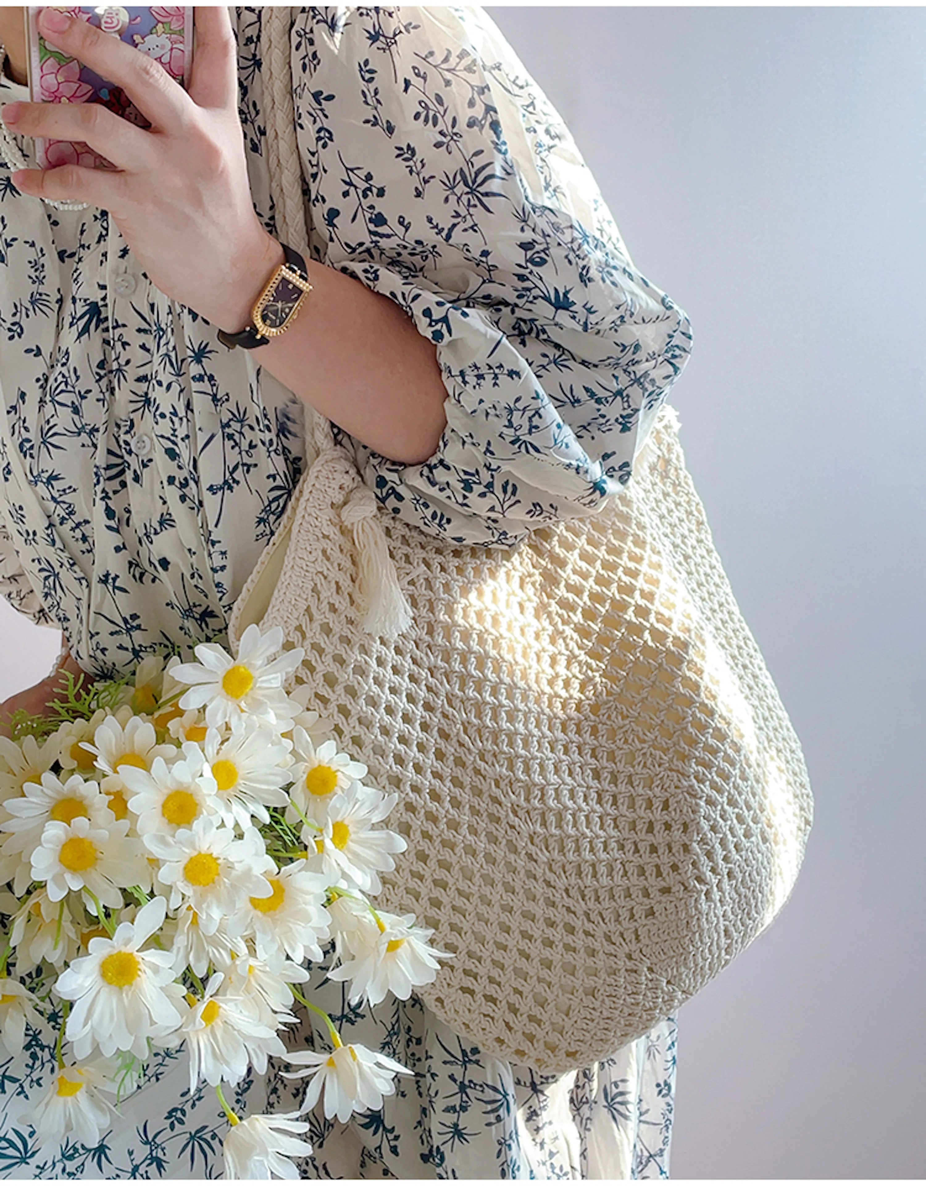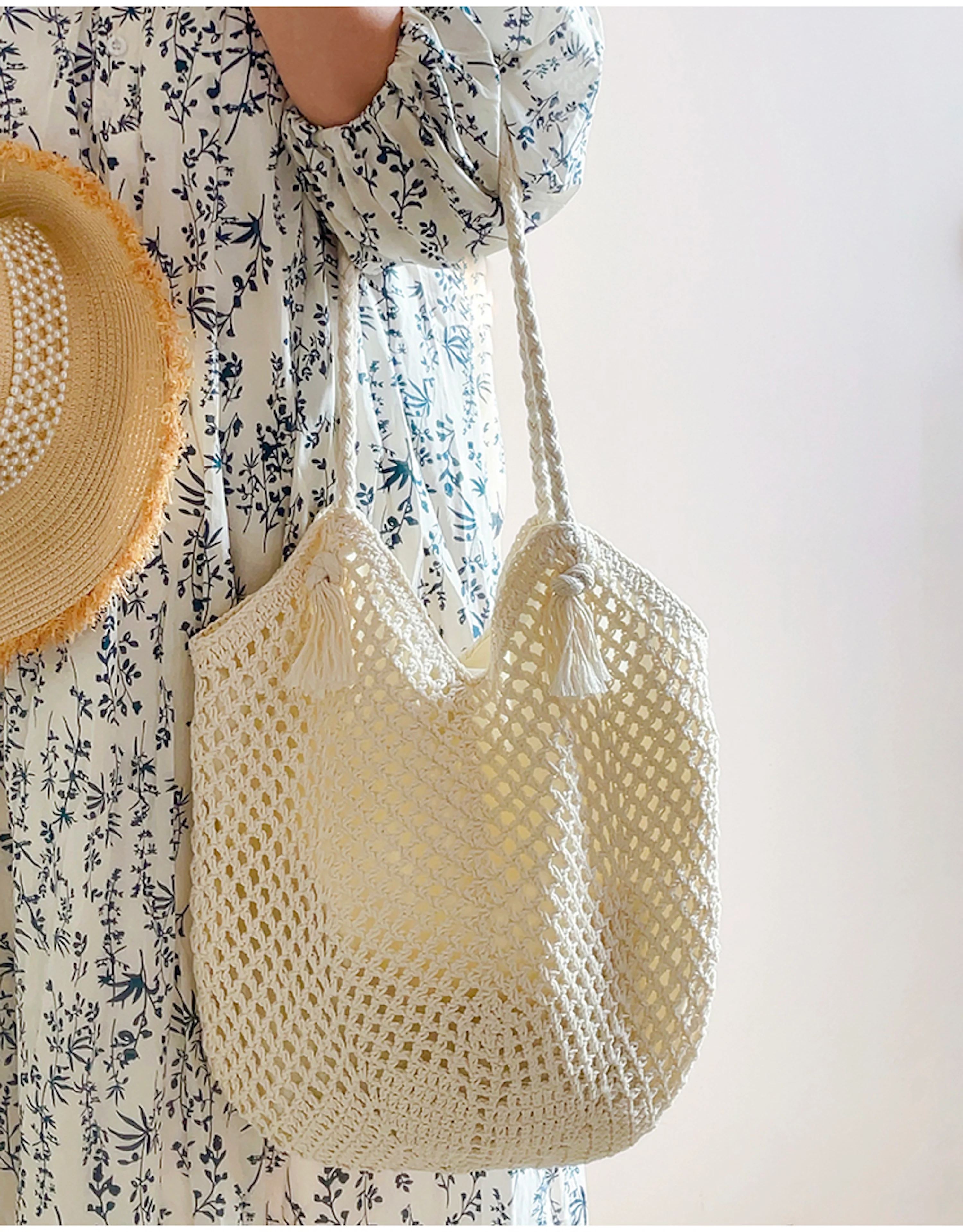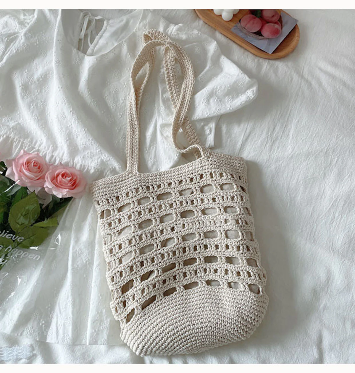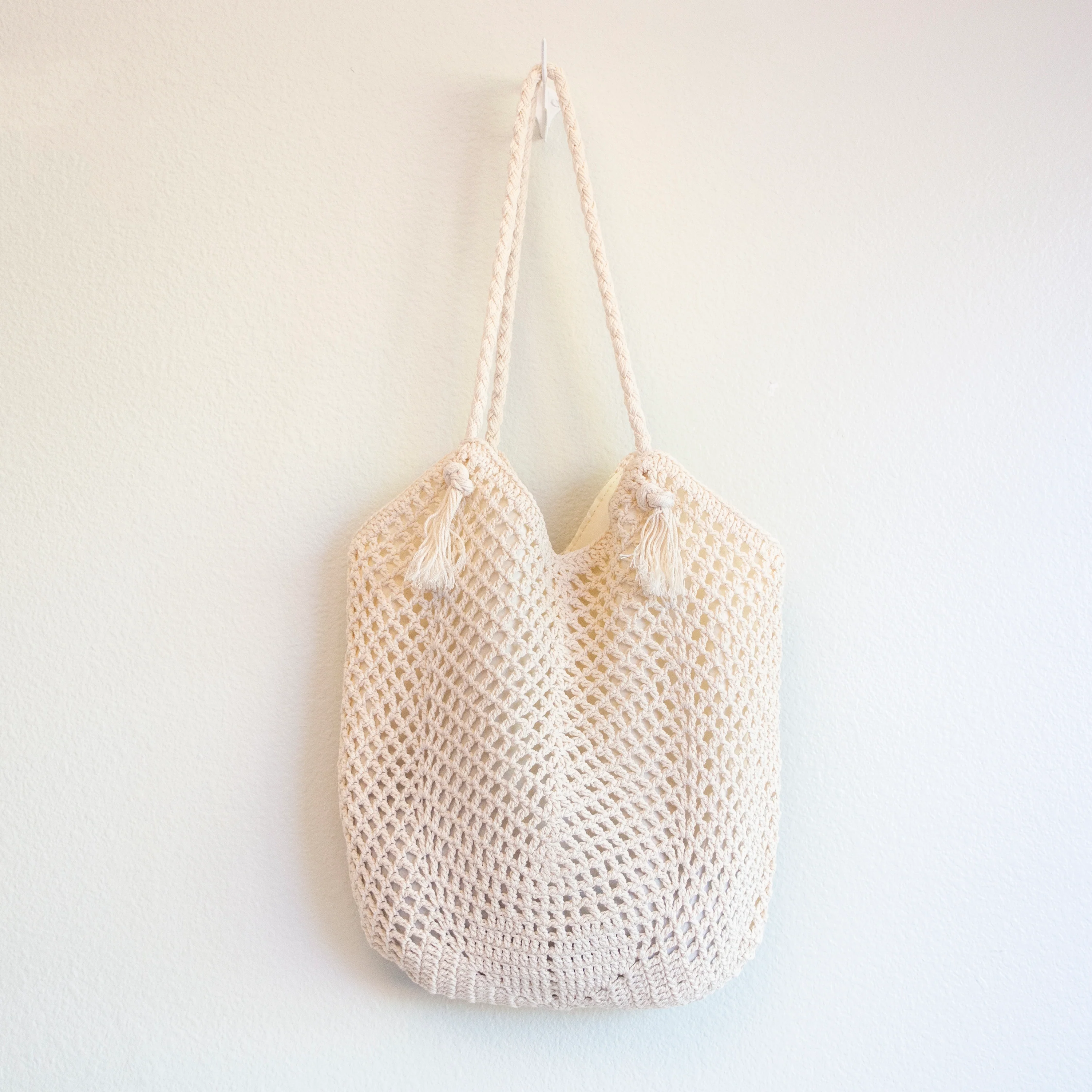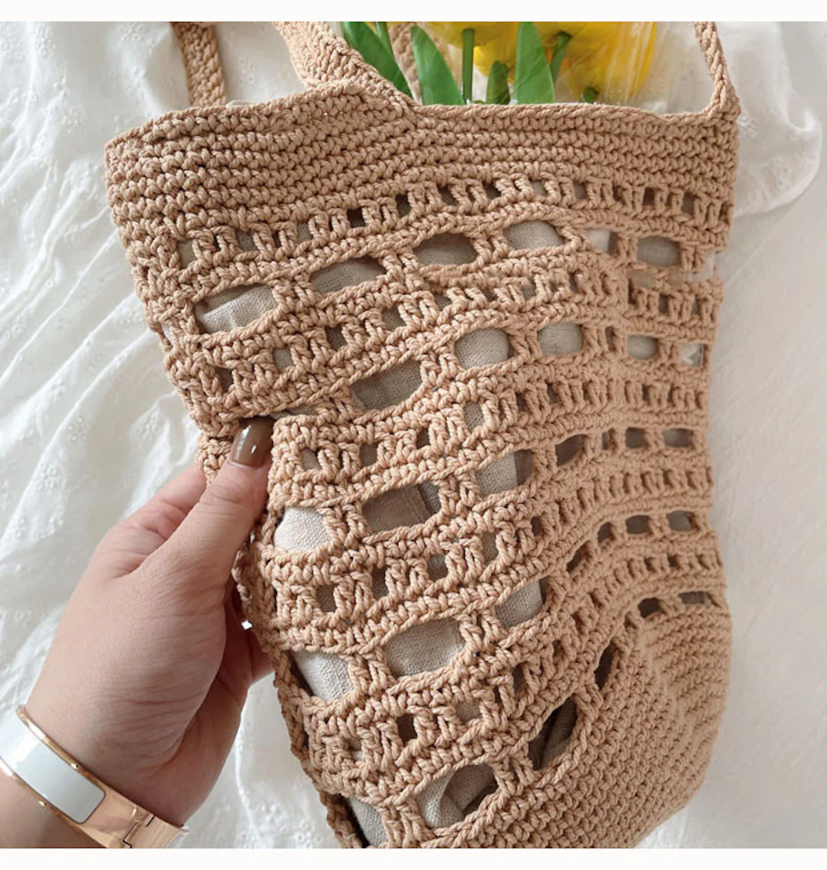 Handmade Crochet Large Cotton Knitted Top Handle Bag with Fishnet Design