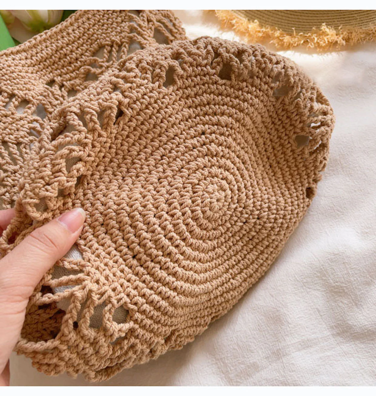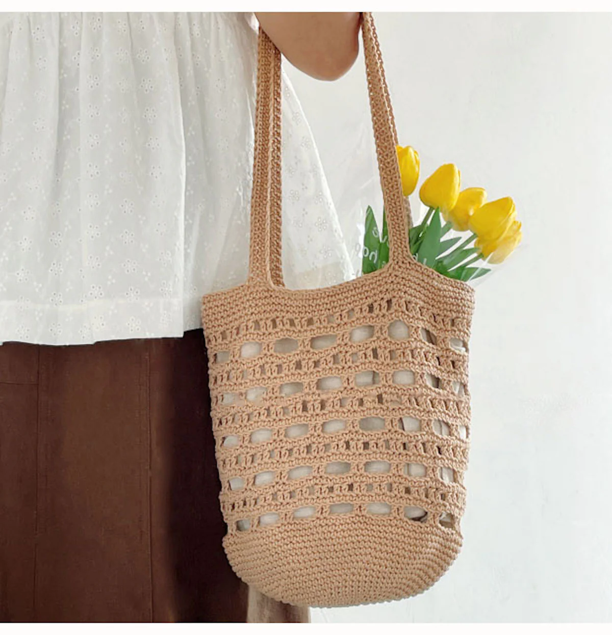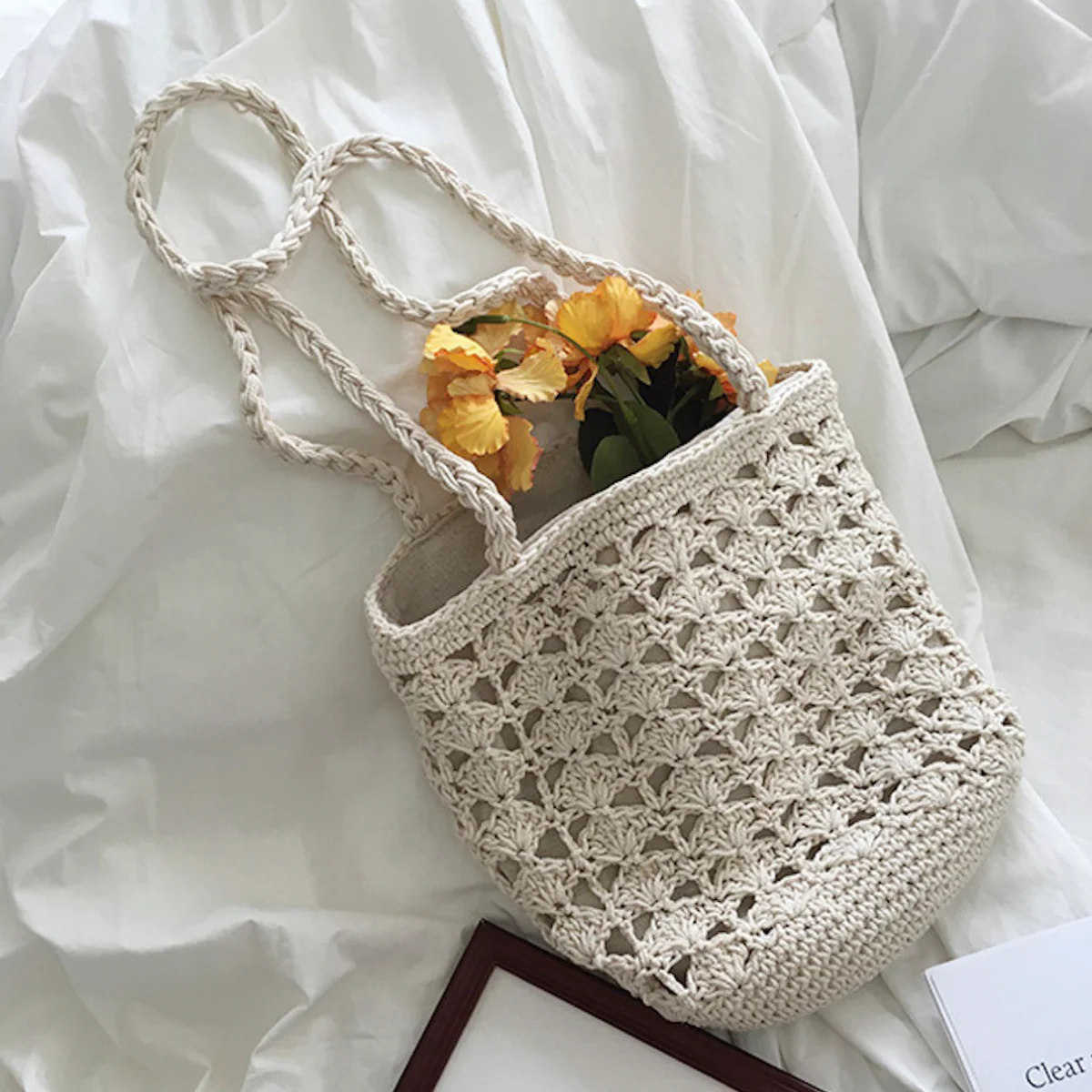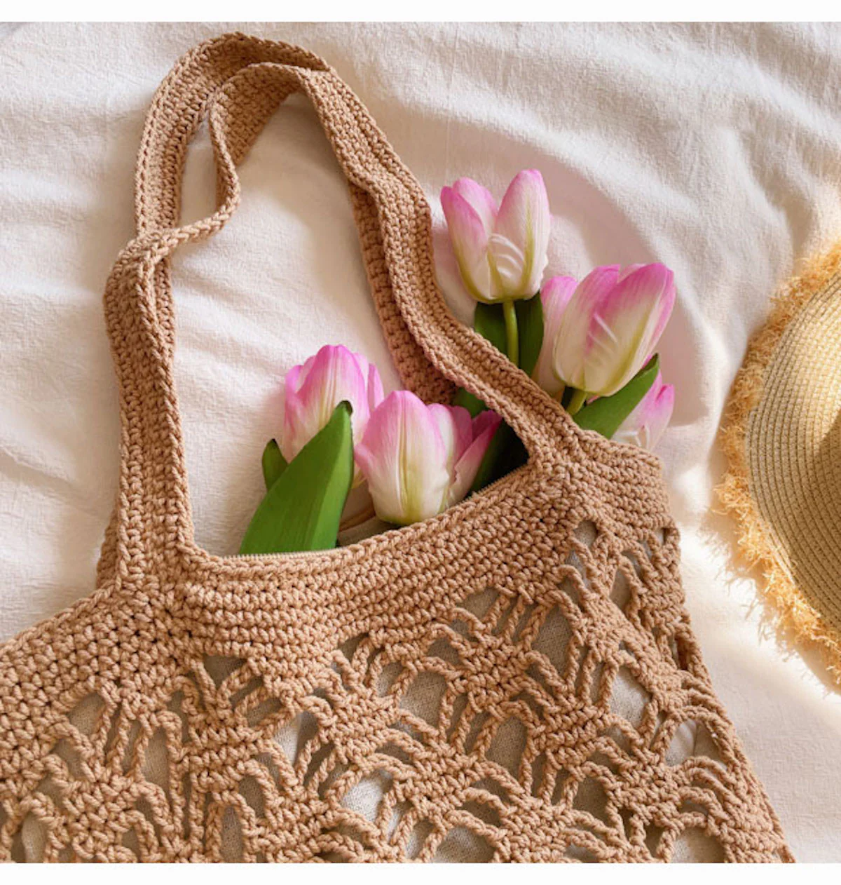 Handmade Crochet Large Cotton Knitted Top Handle Bag with Fishnet Design