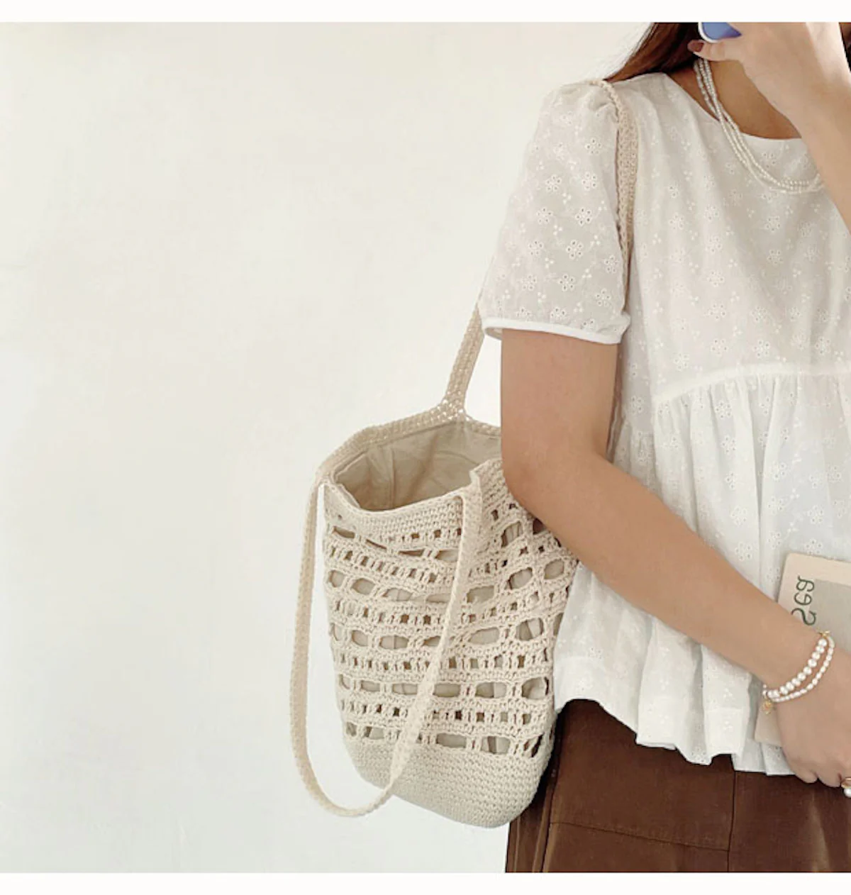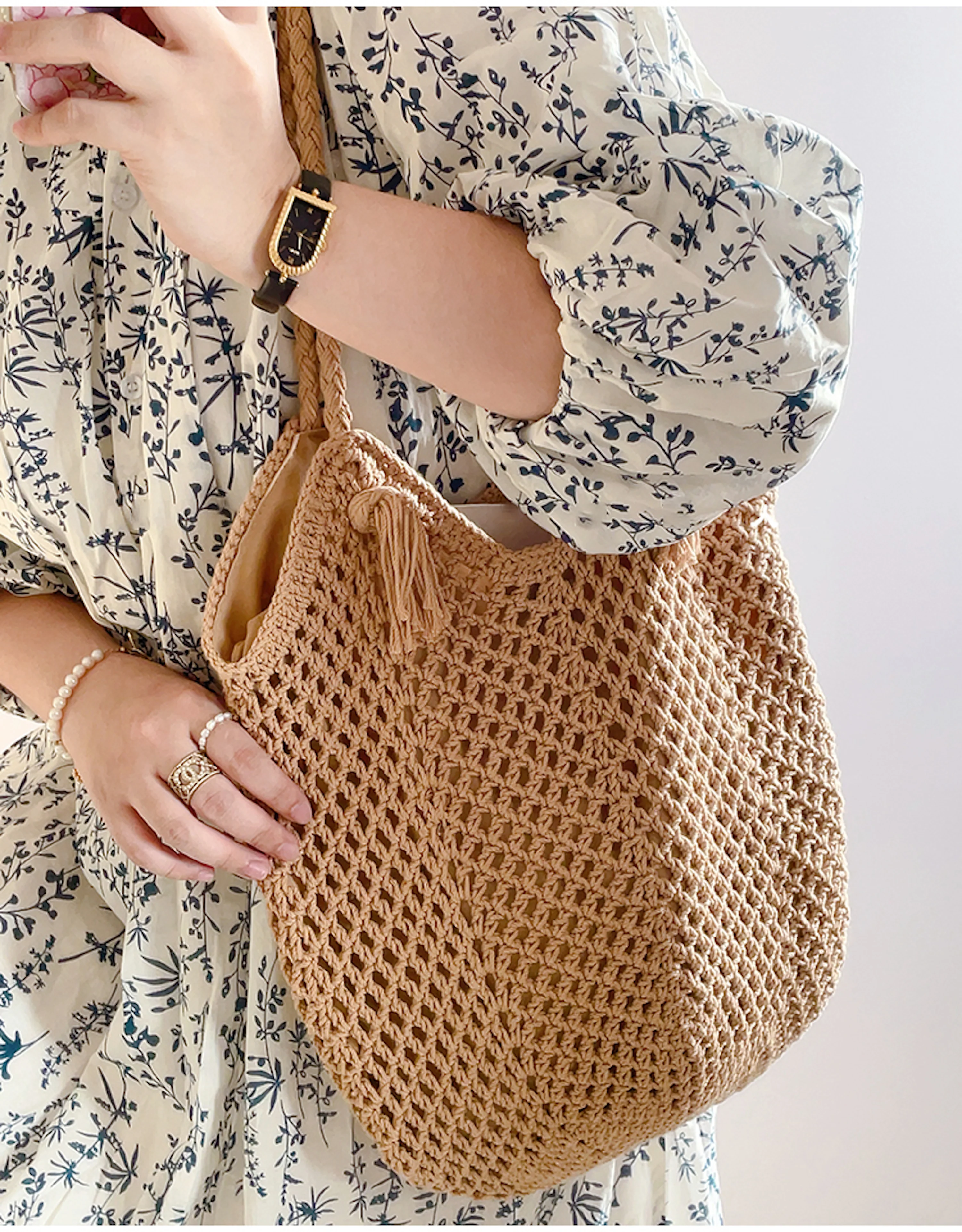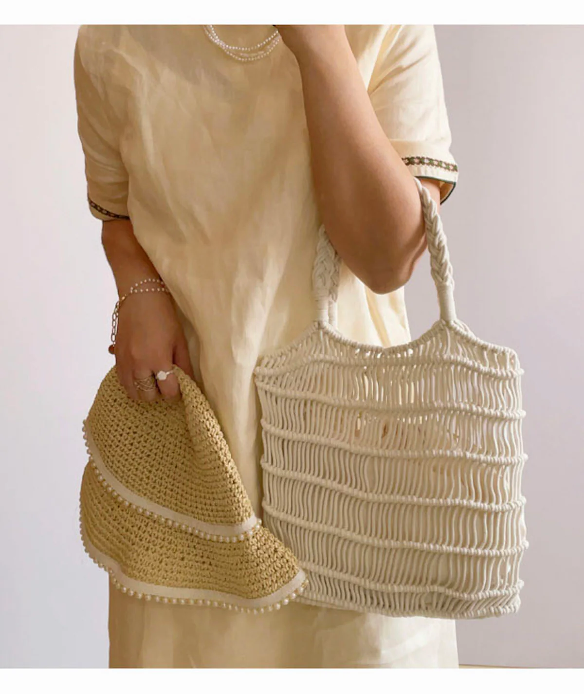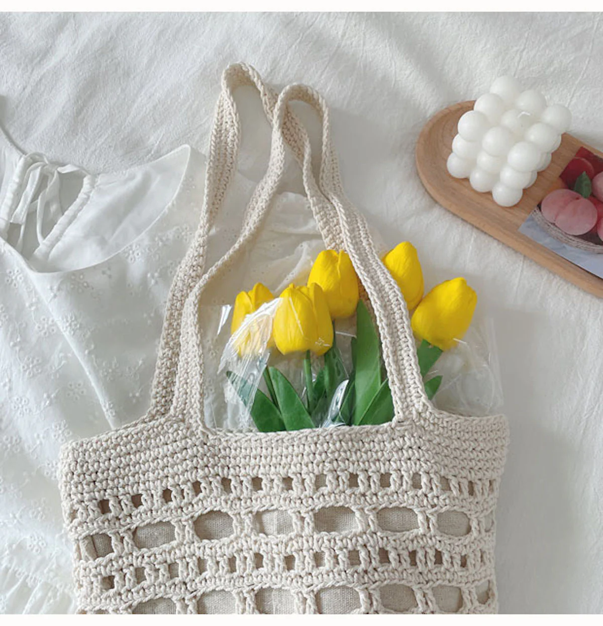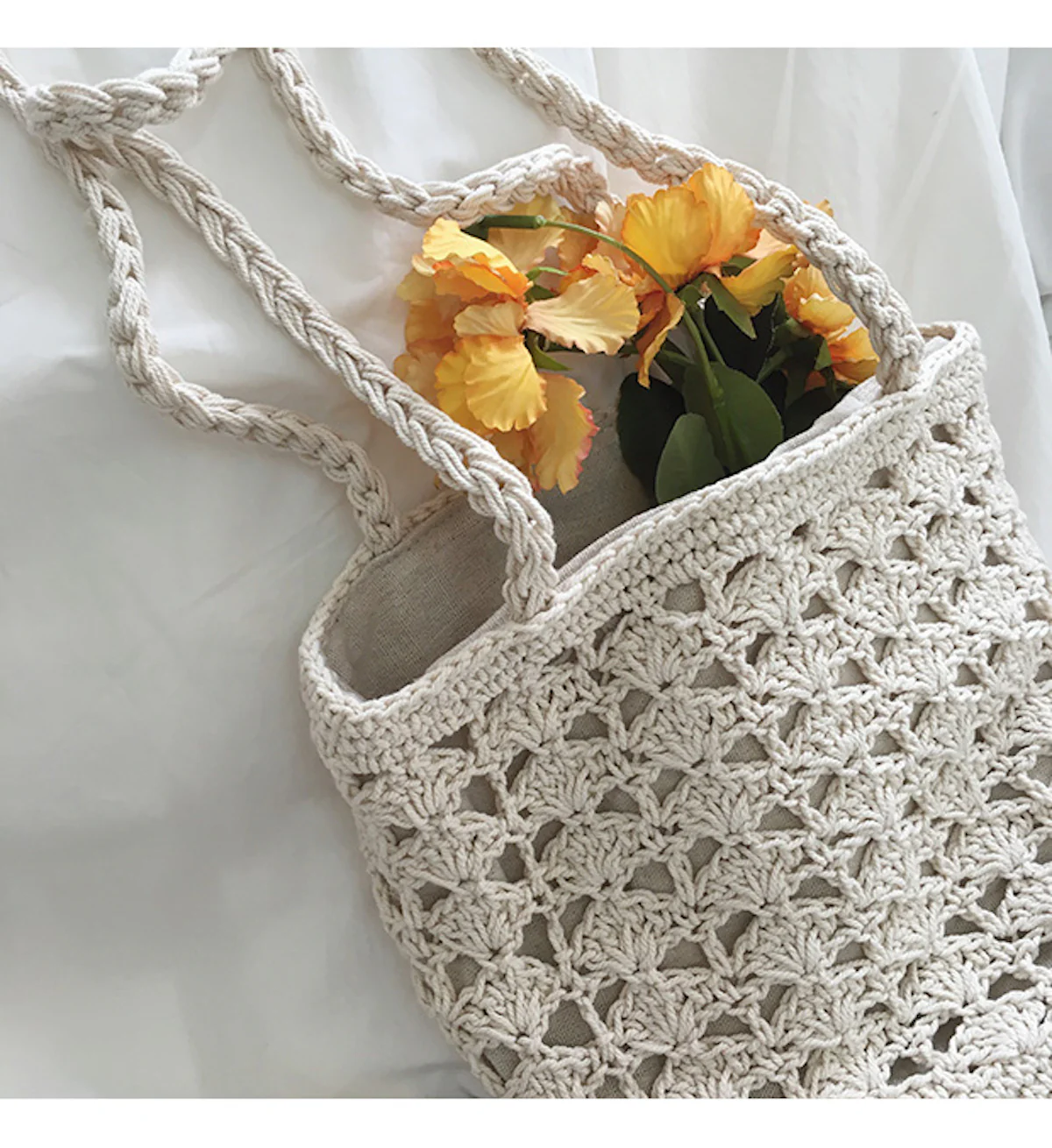 Handmade Crochet Large Cotton Knitted Top Handle Bag with Fishnet Design