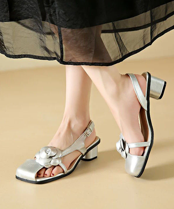 Art Floral Splicing Chunky Sandals Silver Faux Leather Buckle Strap