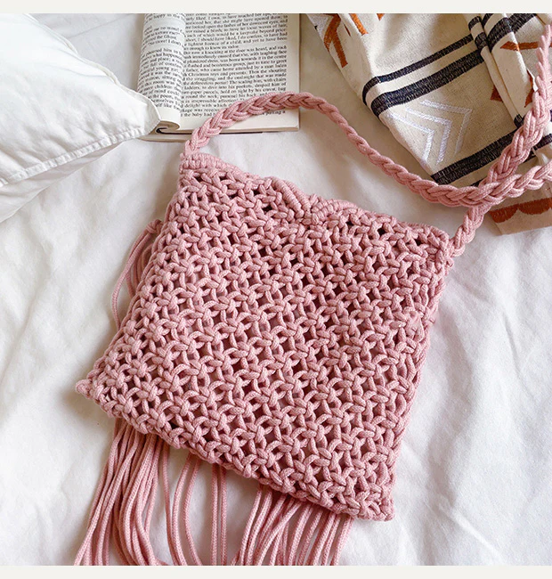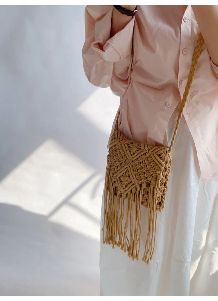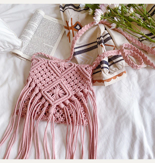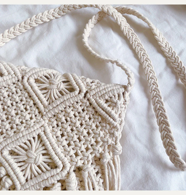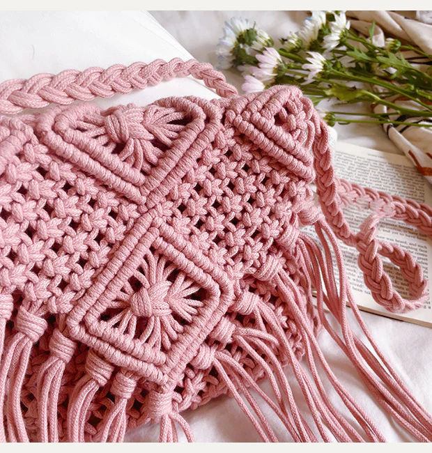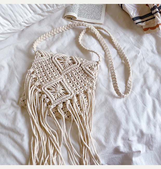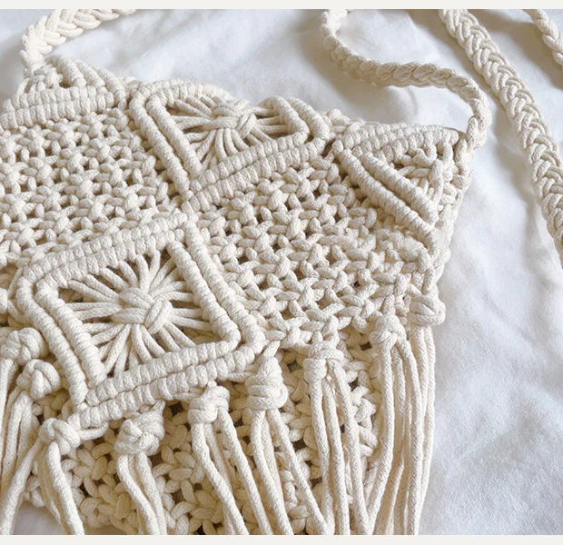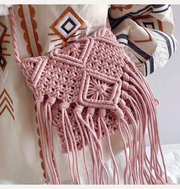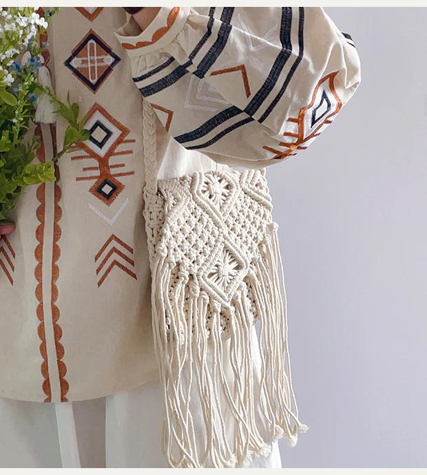 Retro Cotton Macrame Crossbody Bag with Tassels